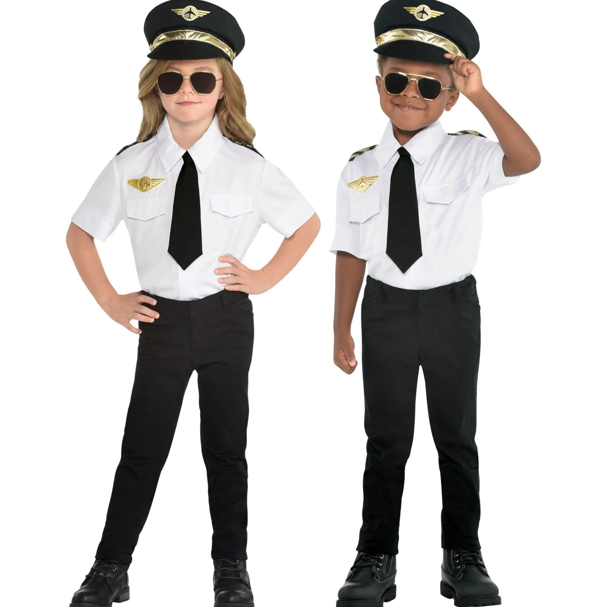 This Airplane Pilot Costume Set Includes A White Button-Up Shirt With A Pair Of Printed Wings On The Chest, A Simple Black Tie, A Pilot Hat With Gold Details, And Aviator Glasses To Pull It All Together. Whether For Halloween Or Everyday Play, This Pilot Costume Will Have Them Ready For Takeoff.