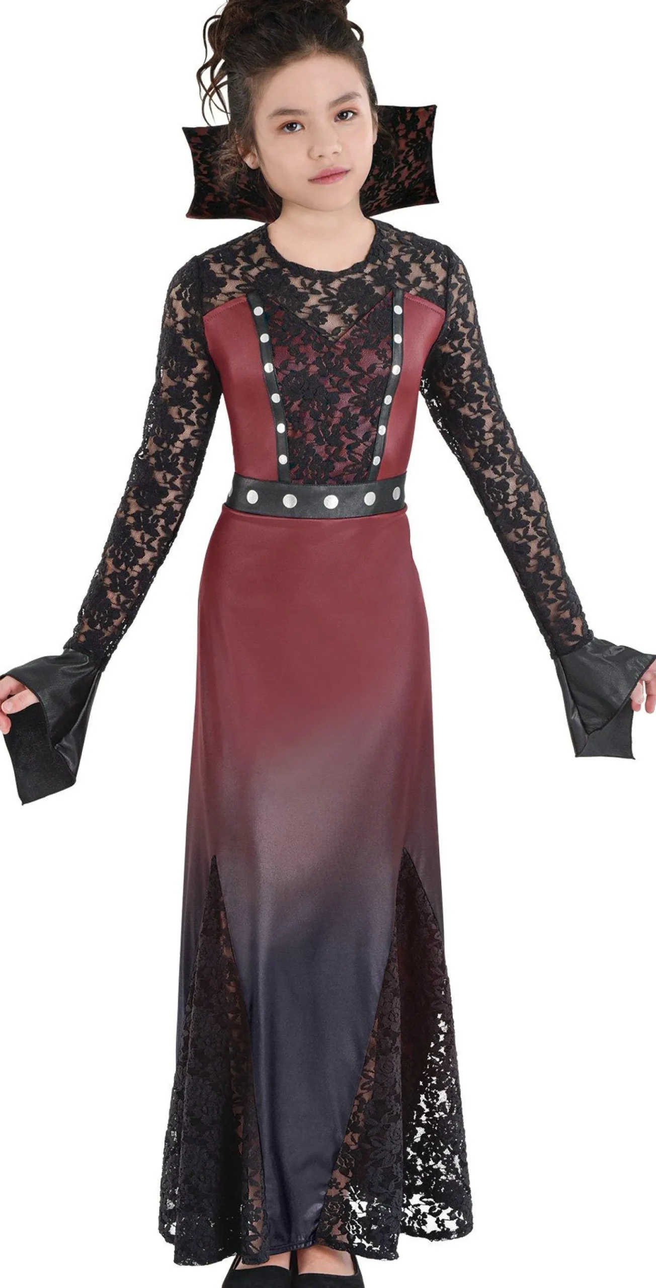 A Powerful Vampire Emerges This Halloween, And She’s Thirsting For Blood! The Dark Countess Costume Is A Gothic-Inspired Dress That Features Crimson Ombre Faux-Leather With Printed Studs And A Floral Black Lace Center And Sleeves. A Behind-The-Neck Stiff Black Lace Collar Completes This Vampiric Look.