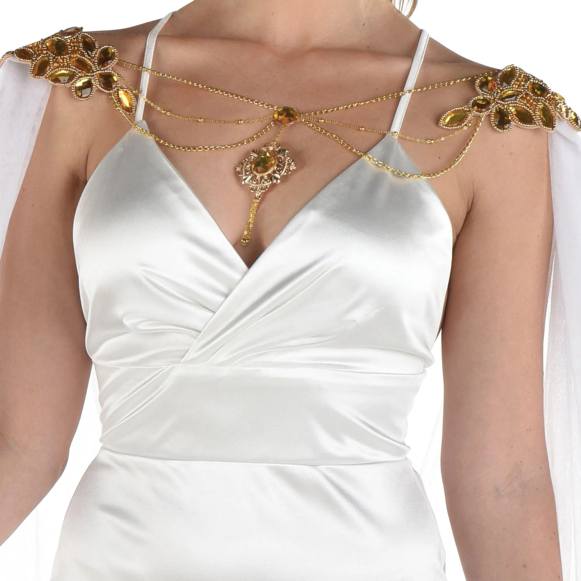 Channel Your Inner Roman Empress With This Ethereal White Tulle Cape, Complete With Applique Shoulder Coverings And Resplendent Gold Chains And Gemstones That Drape Along Your Chest And Back.