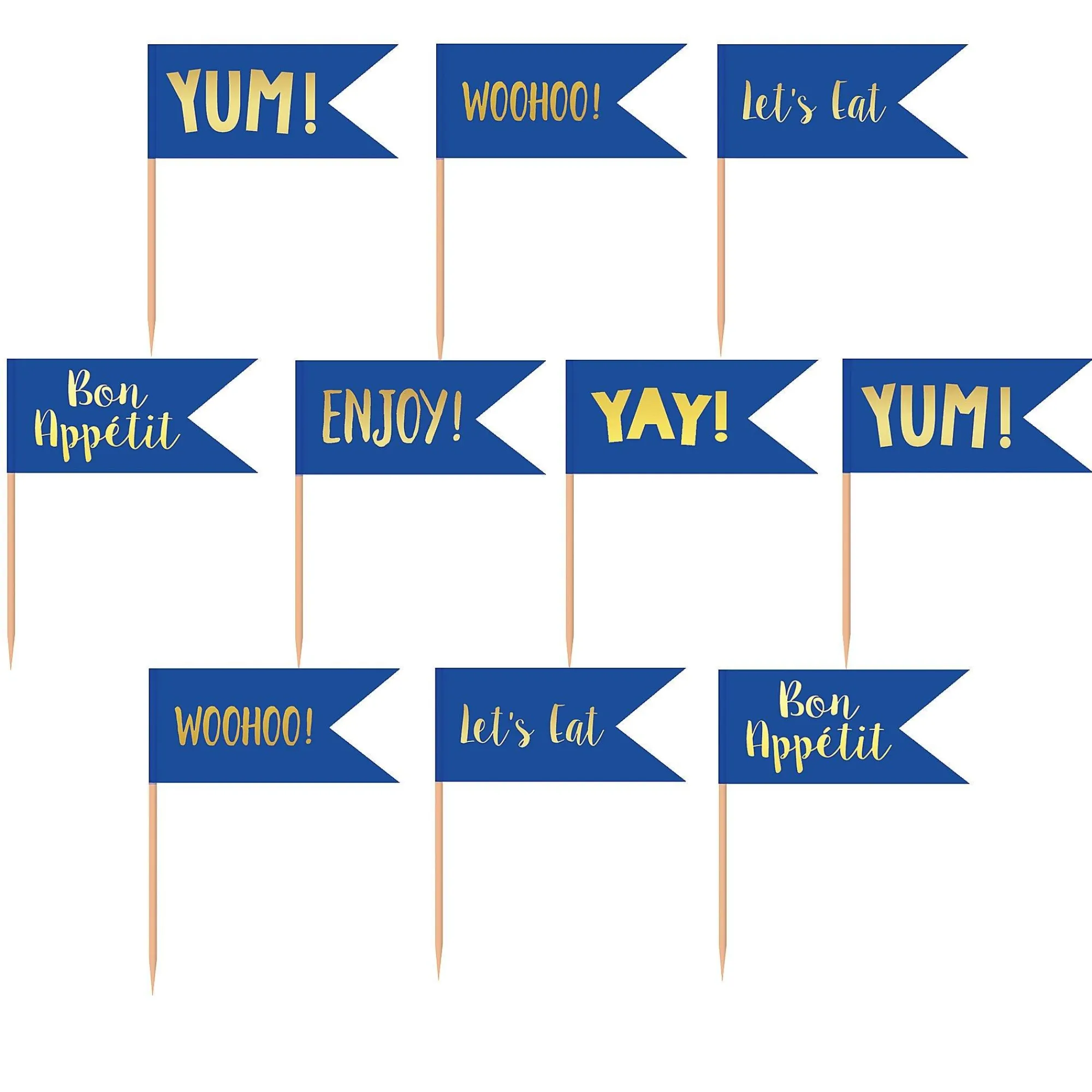 Add A Colorful Message To Your Treats With Royal Blue Party Picks! These Paper Picks Feature Swallow-Tailed Paper Pennant Flags In Royal Blue That Are Printed Each With A Fun Word Including Yum! Enjoy, Or Bon Appetit. Insert These Party Picks Into Cupcakes, Brownies, Tarts, And Other Treats. Pennant Flag-Style Paper Picks Add A Sweet Touch To Treats For A Cocktail Party, Tea Party, Anniversary Party, Or Any Other Special Occasion.