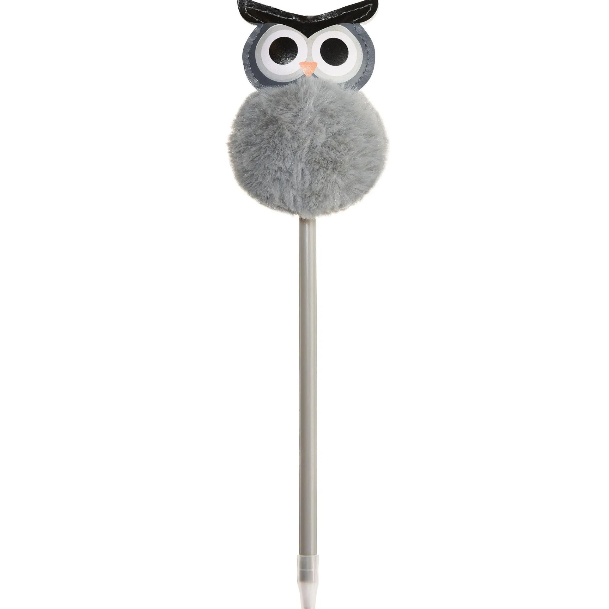 A Puffy-Topped Owl Pen Makes A Perfect Classroom Prize, Halloween Treat, Or Party Favor. The Gray Pen Has A Yarn Pom-Pom Owl On Top And Black Ink.