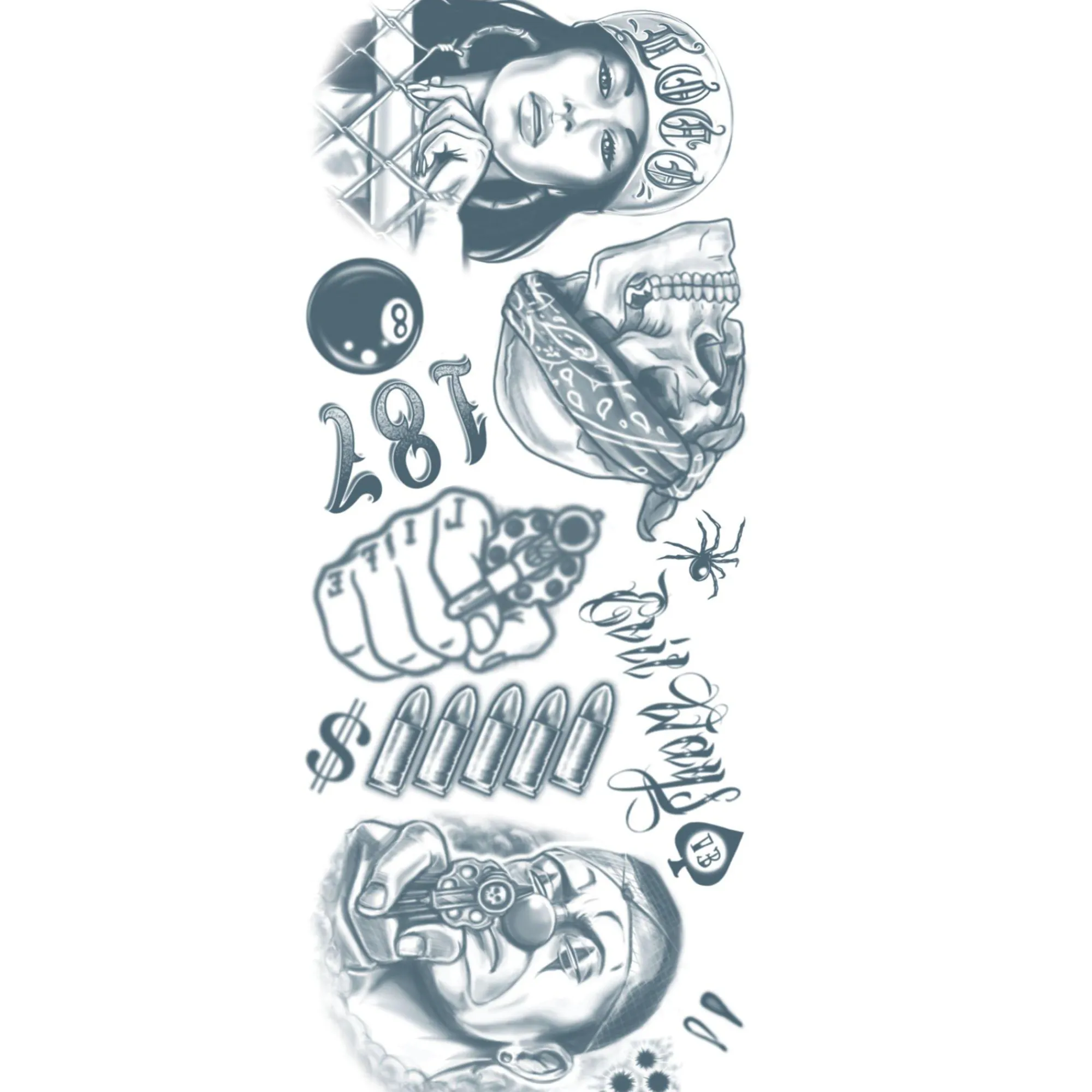 Add To Your Costume With This Set Of Classic Black And Gray-Style Temporary Tattoos. The Sheet Features Designs Like An Eight Ball, Spider, Skull, Tear Drops, And More.