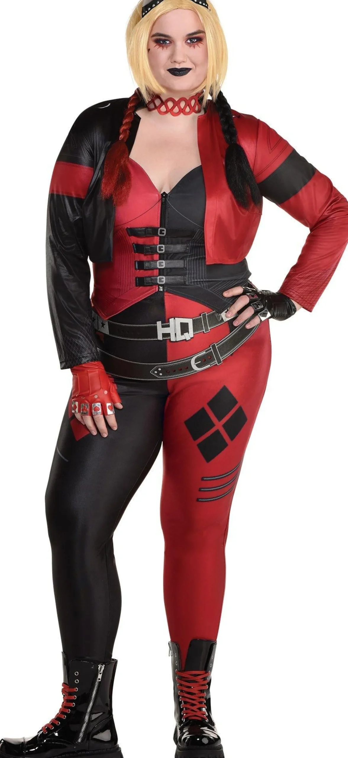 Cause A Ruckus In This Form-Fitting Black And Red Ensemble. The Corset-Style Top Features Straps Across The Bodice And An Attached Bolero Jacket. The Printed Leggings Have A Harlequin Pattern On The Thigh And An Hq Belt To Ensure Everyone Knows Exactly Who Entered The Party.
