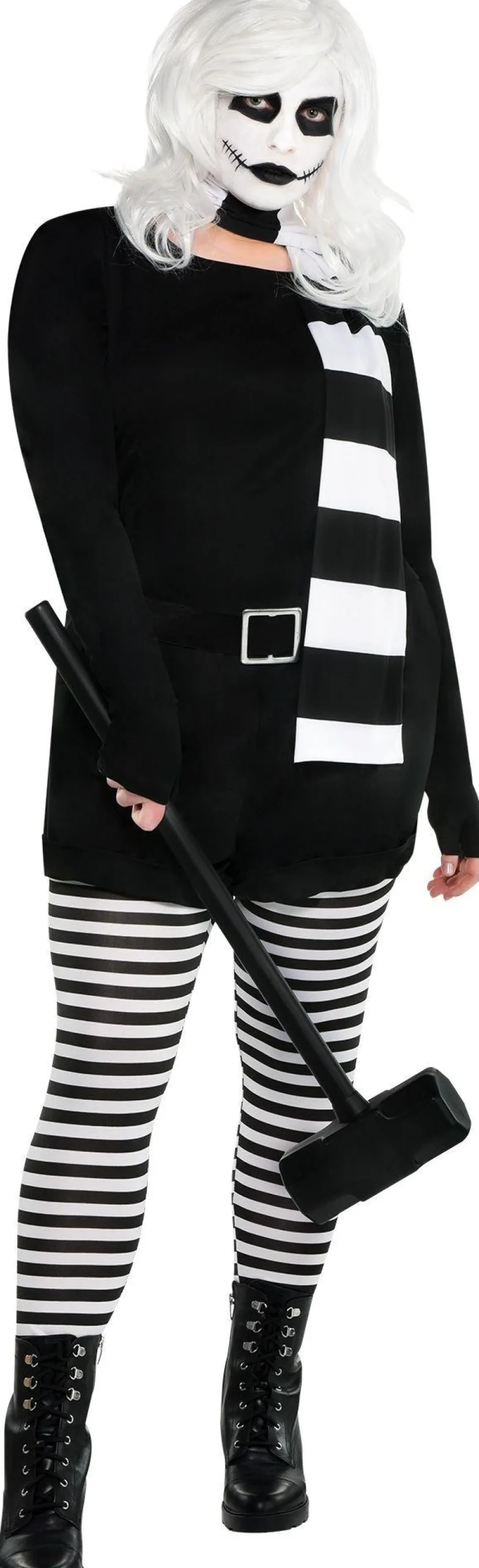 Take A Twisted Trip Down The Rabbit Hole In The Plus-Size Psycho Alice Costume For Adults. This Black-And-White Costume Includes A One-Piece Jumpsuit With Attached Striped Leggings And A Belt With A Faux Metal Buckle. The Sleeves Extend Past The Wrist Wth Thumbholes. Finish Off Your Sinister Look With A Feathered, Shoulder-Length White Wig And A Black And White Striped Scarf.