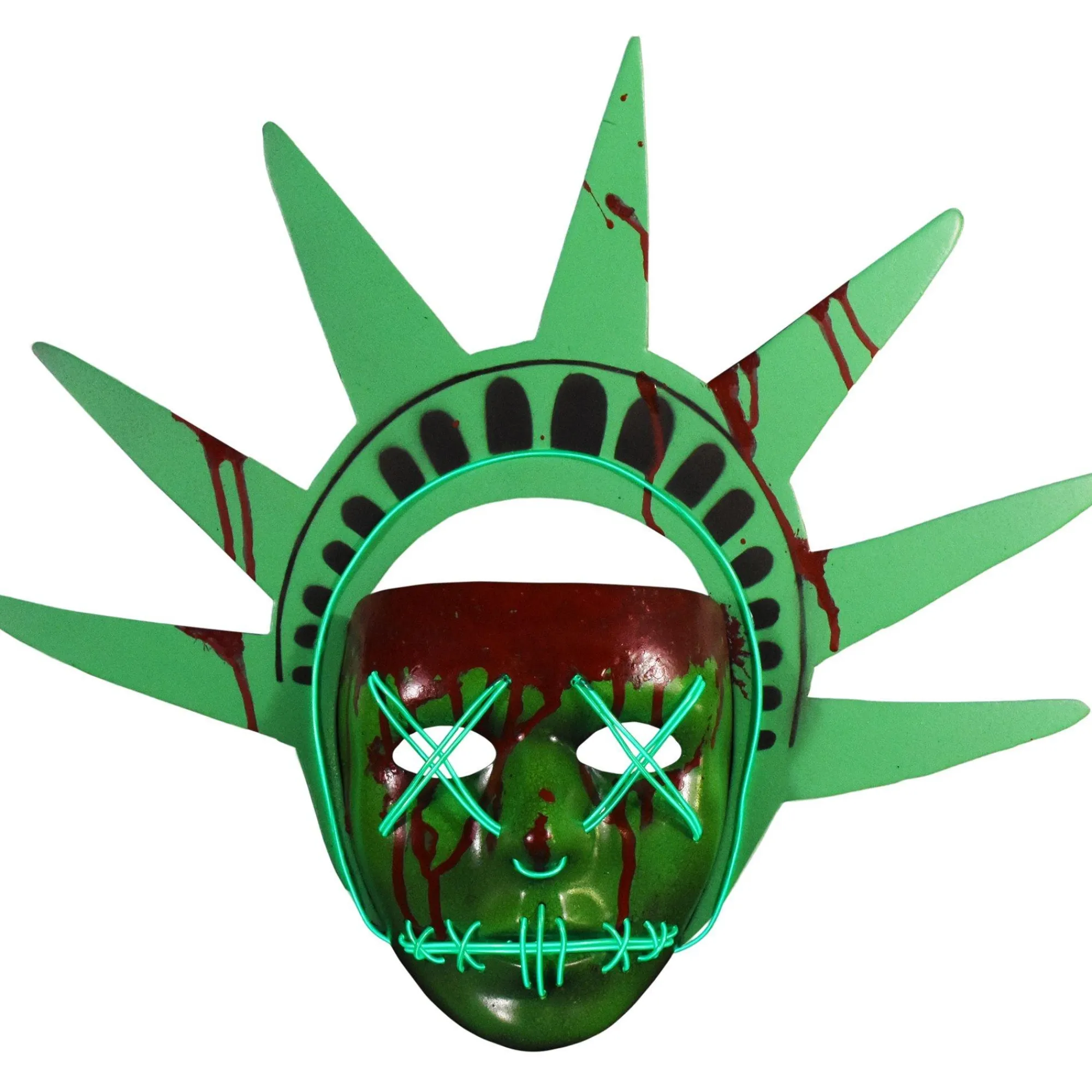 Celebrate Your Right To Purge With A The Purge: Election Year Light-Up Lady Liberty Mask! This Creepy Green Face Mask Features Blood Stains And Green Wires Stitched Across The Mouth And Eyes. Light The Green Wires With The On/Off Button On The Attached Battery Pack. The Connected Bloody Foam Crown Makes You Look Just Like The Iconic Lady Liberty Purger From