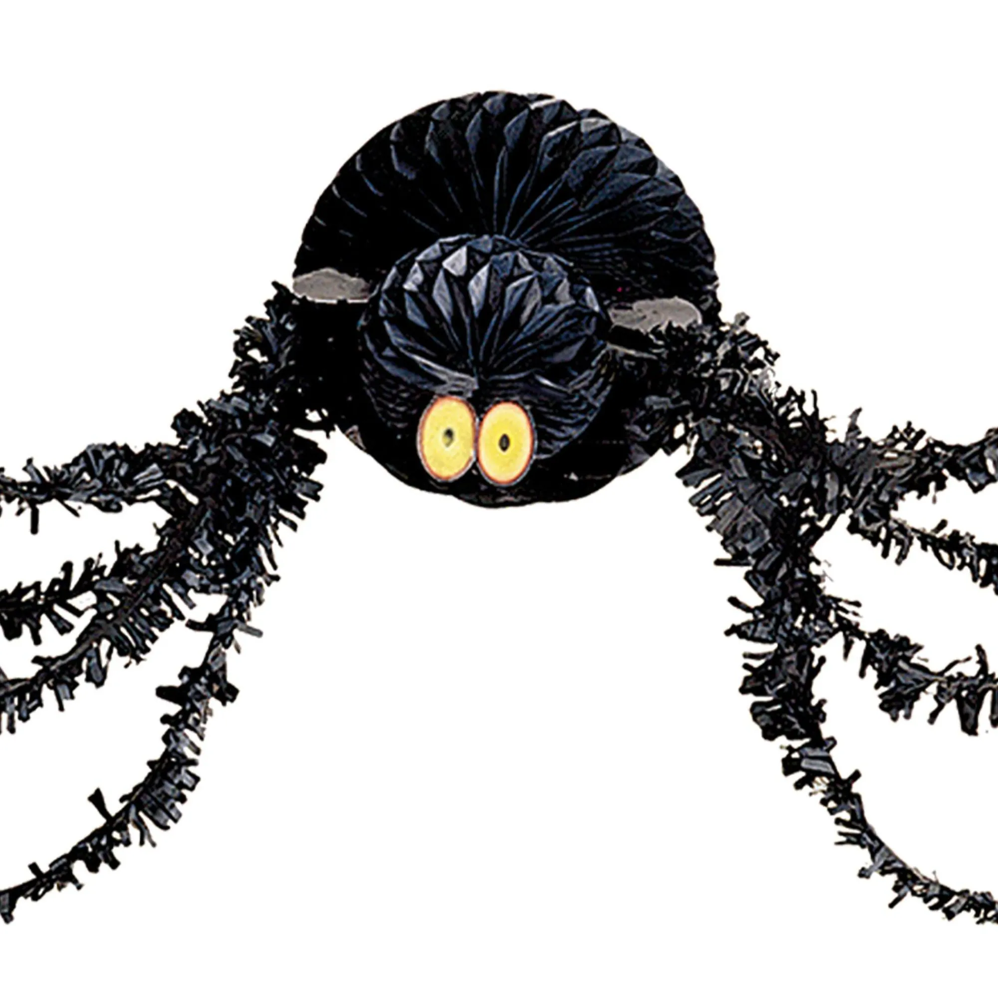 Surprise Your Halloween Guests With A Giant Black Spider Hanging On The Wall. This Spider Decoration Features Tinsel Legs Attached To A Honeycomb Paper Head.