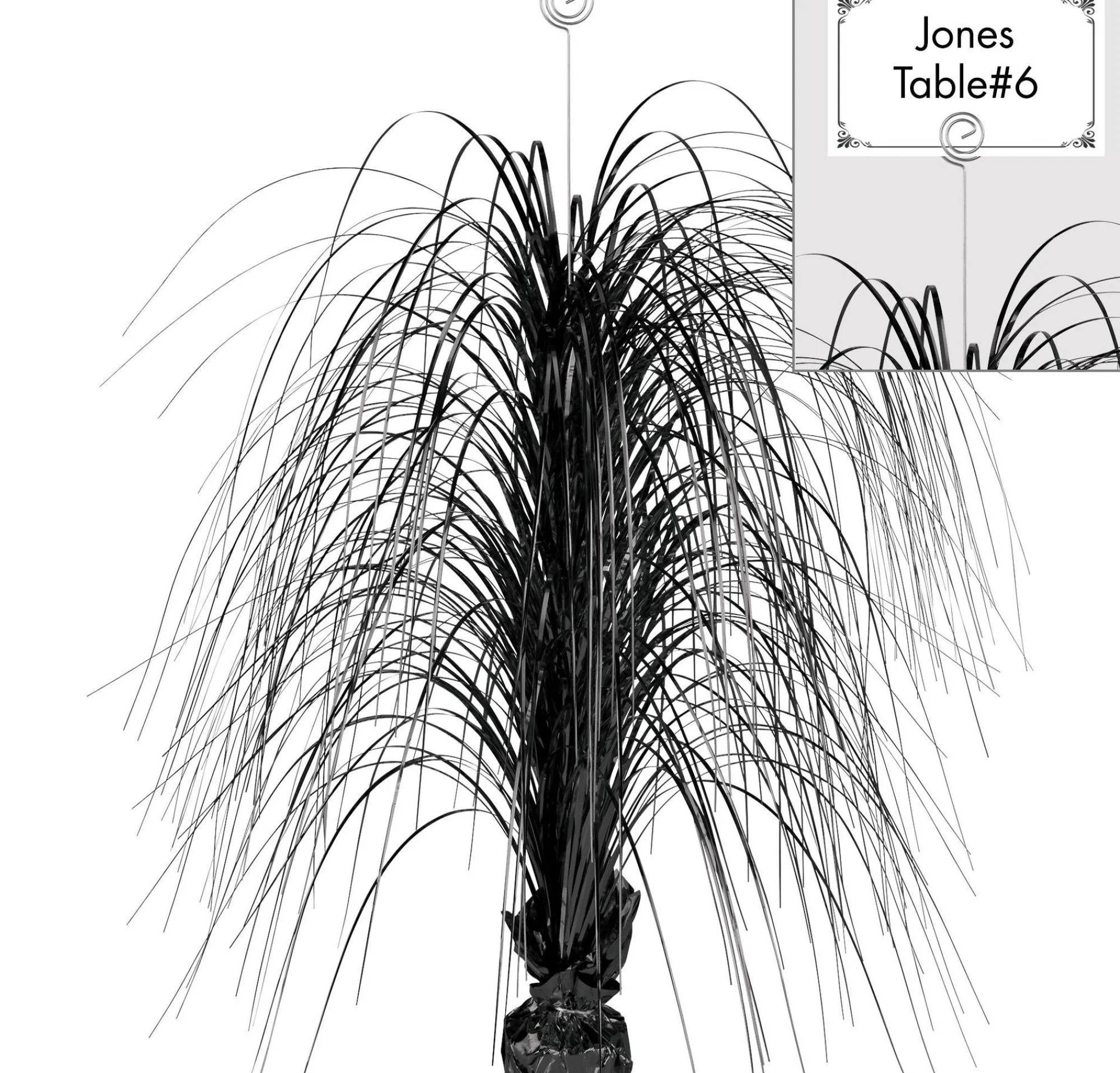 Now Here’s A Black Centerpiece That Makes A Statement! The Giant Black Spray Centerpiece Stands Over 2Ft Tall And Is Solid Shiny Black. This Black Centerpiece Includes A Curled Metal Holder That Sticks Out Of The Top For A Place Card Or Table Number. With Long Black Strands And A Weighted Base, It’s An Easy Table Decoration At Your Black-Themed Party.