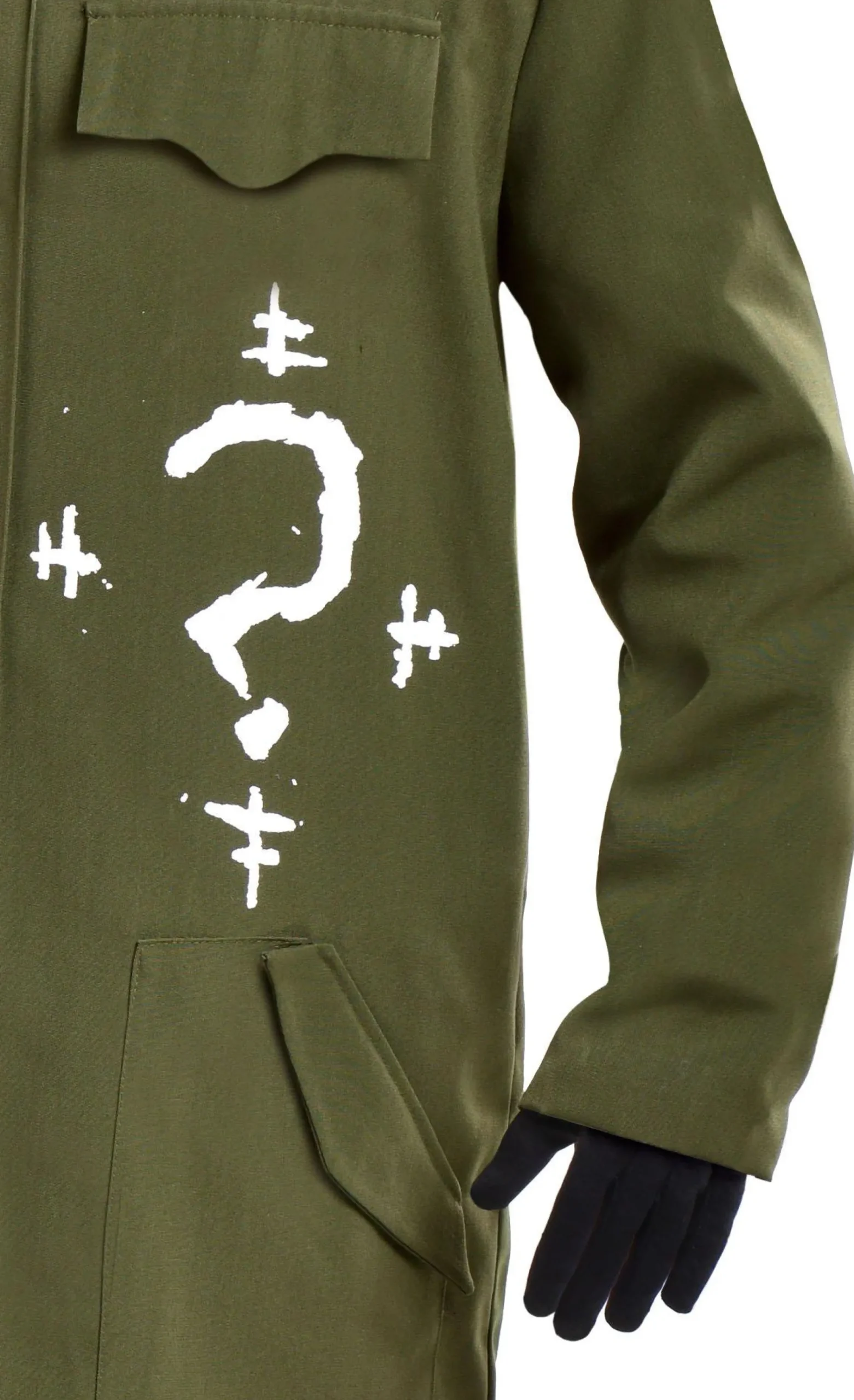 Transform Yourself Into The Scariest Version Of The Riddler To Date With This Officially Licensed Dc Films Costume. The Trench Coat Is Dark Green And Features A Hood, Functional Side Pockets, And Riddler’s Question Mark Logo. Leave The Coat Open Or Close It Up With The Large Front Buttons. The Mask Is Faux Leather And Features Attached Clear Plastic Glasses. It Has An Open Back And An Attached Elastic Strap So You Can Adjust The Mask To Your Comfort.