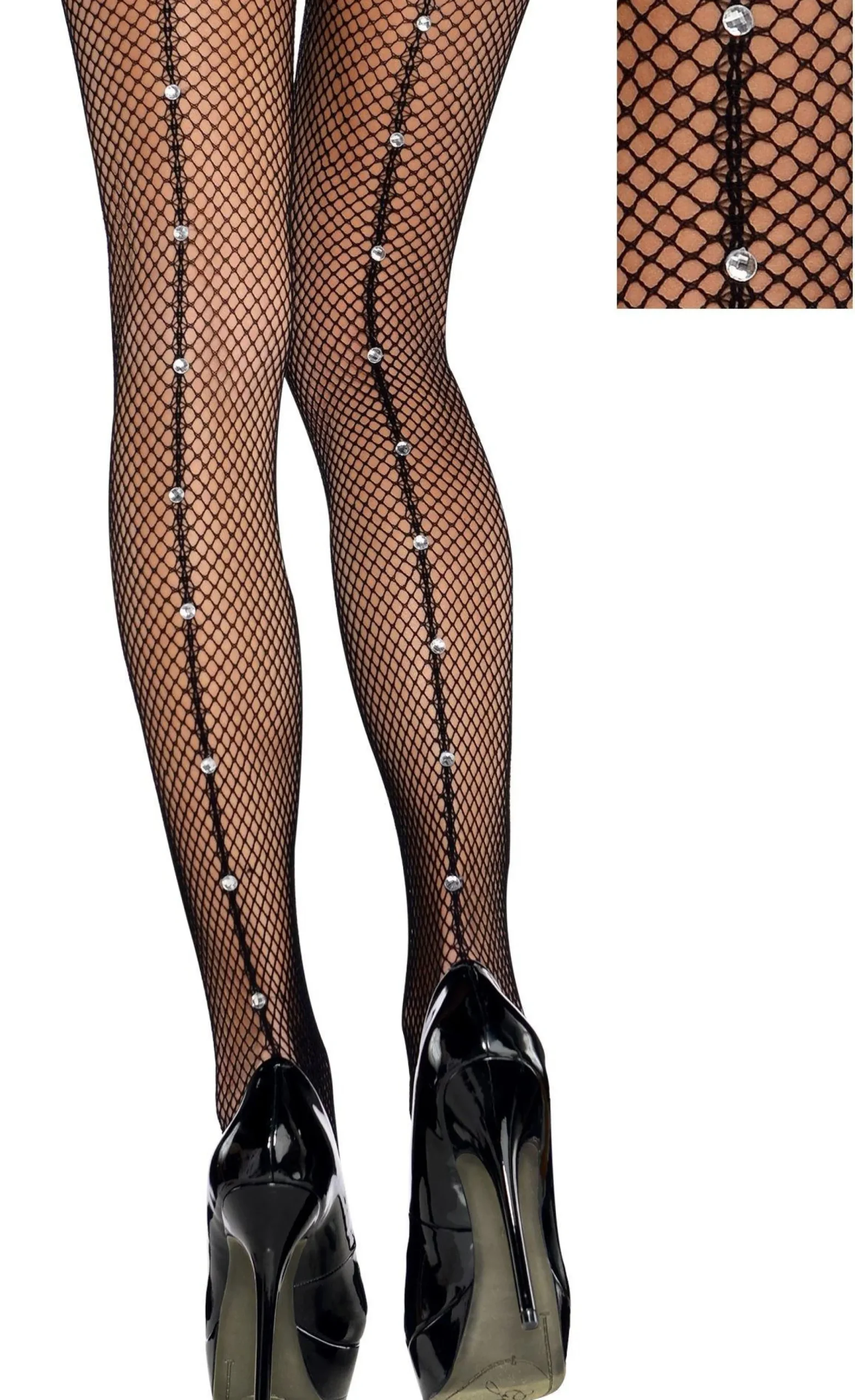 Black Fishnet Pantyhose With Rhinestone Seam Add A Touch Of Sparkle To Your Outfit! With A Sexy Fishnet Design, These 100% Nylon Pantyhose Have Crystal-Clear Rhinestones Lining The Back Seam. Wear With An Alluring Costume Or Year-Round! One Size Black Fishnet Pantyhose With Rhinestone Seam Fits Most Standard Women’s Sizes (5’2-5’9 And 90-160Lb).