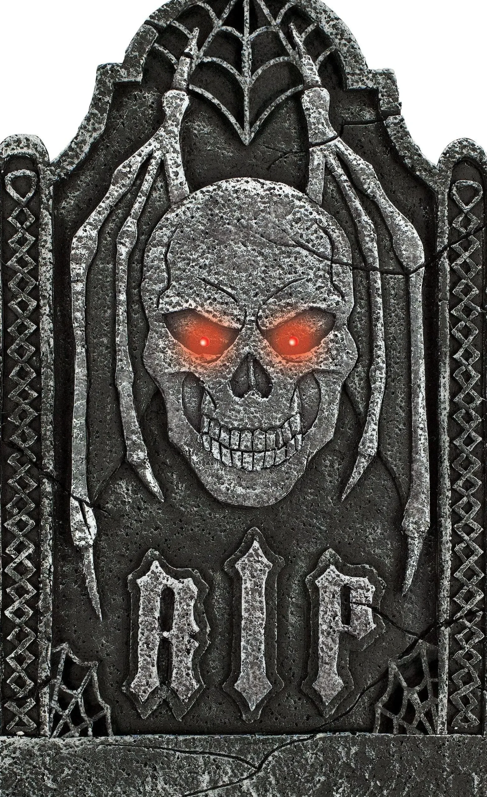 Turn Your Property Into A Haunted Graveyard With A Light-Up Evil Tombstone. The Cracked And Faded Headstone Has Glowing Red Eyes And Is Sure To Frighten Your Halloween Party Guests. Enjoy The Lightweight Foam Headstone With A Skull And Rip Engraved In It. Place It In The Yard For A Classic, Spooky Look That Your Guests Will Remember For All Eternity.