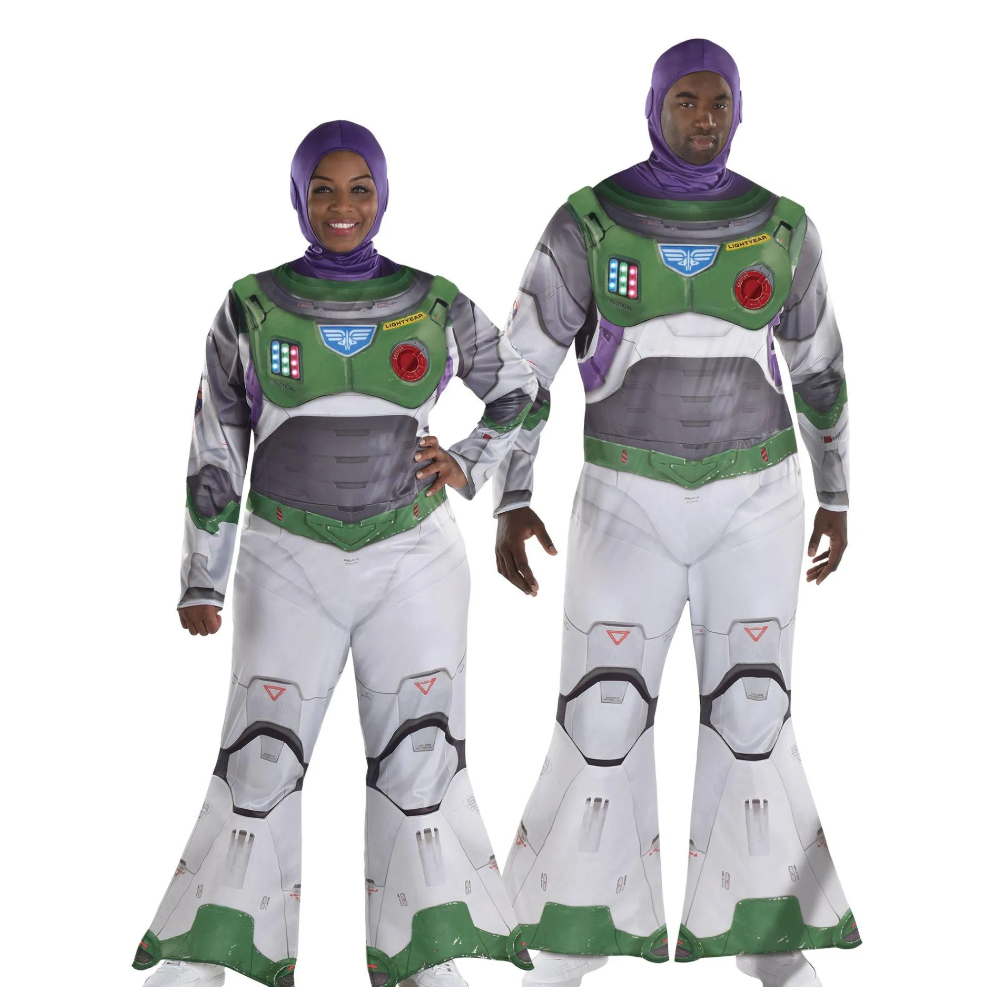 Suit Up For An Exciting Halloween Mission With This Officially Licensed, Plus-Size Buzz Lightyear Costume. It Includes A Purple Hood And A Structured Chest Piece With A Light Up Panel, All Paired With A Jumpsuit With Printed Designs And A Flared Hem.